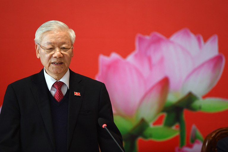 Tổng bí thư Nguyễn Phú Trọng tại họp báo kết thúc Đại hội 13 ở Hà Nội hôm 1/2/2021. Ông Trọng là người đứng đầu phong trào chống tham nhũng rộng khắp trong Đảng. Hình: AFP