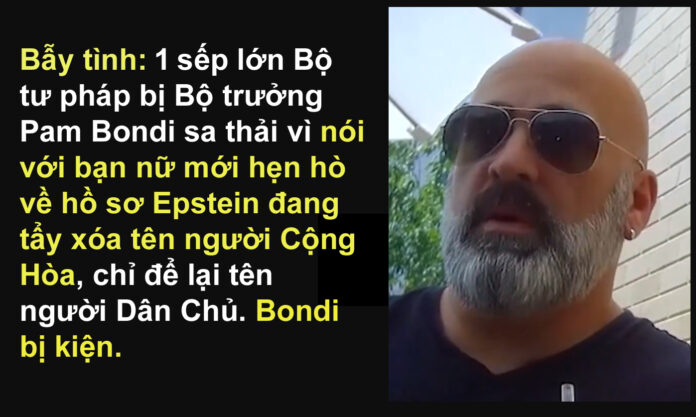 Bẫy tình: 1 sếp lớn Bộ tư pháp bị Bộ trưởng Pam Bondi sa thải vì nói với bạn nữ mới hẹn hò về hồ sơ Epstein đang tẩy xóa tên người Cộng Hòa, chỉ để lại tên người Dân Chủ. Bondi bị kiện.
