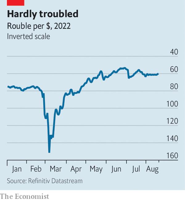 Tuy nhiên, chỉ mất một vài tuần để đồng rúp tăng giá trở lại, cho phép CBR giảm lãi suất nhanh chóng, xuống còn 8% vào ngày 25 tháng 7. Tỷ giá hối đoái chính thức không phản ánh nhu cầu thực sự đối với tiền tệ: các biện pháp kiểm soát vốn, được áp đặt lần đầu tiên sau khi CBR bị đóng băng, vẫn được duy trì phần lớn. Nhưng nó vẫn chỉ ra một lỗ hổng trong kế hoạch ban đầu của phương Tây. Trong khi CBR vẫn không cách nào chạm đến kho đô la Mỹ và euro ở nước ngoài, Nga vẫn kiếm được tiền mặt hàng ngày nhờ xuất khẩu kho dầu và khí đốt khổng lồ của mình. Điều này có nghĩa là Nga không cần phải đi vay, khiến cho việc vỡ nợ của Nga không gây ra đổ vỡ dây chuyền nào.