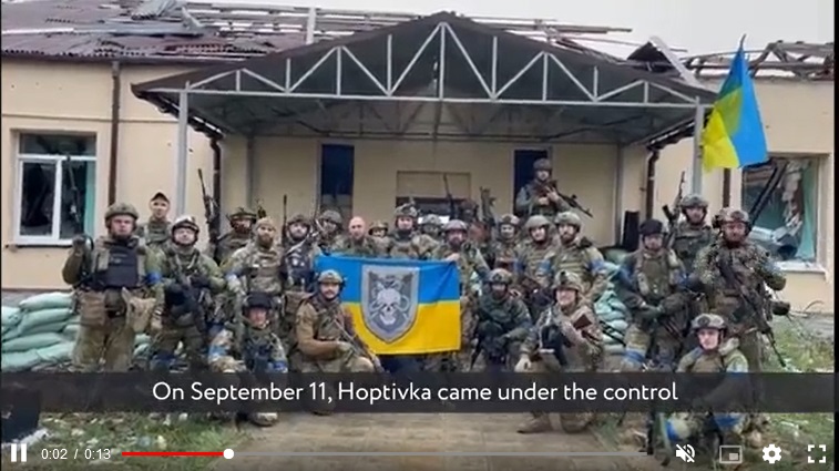 Ảnh 2: Trích đoạn video Bộ Quốc phòng Ukraine đăng lên Twitter ngày 12/9 cho thấy quân Ukraine đã chiếm trạm kiểm soát Hoptivka ở biên giới với Nga.