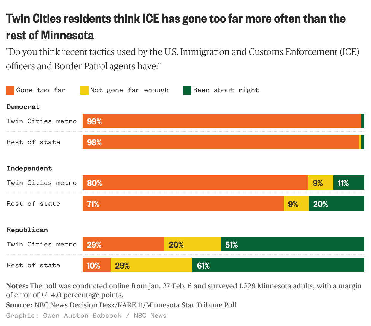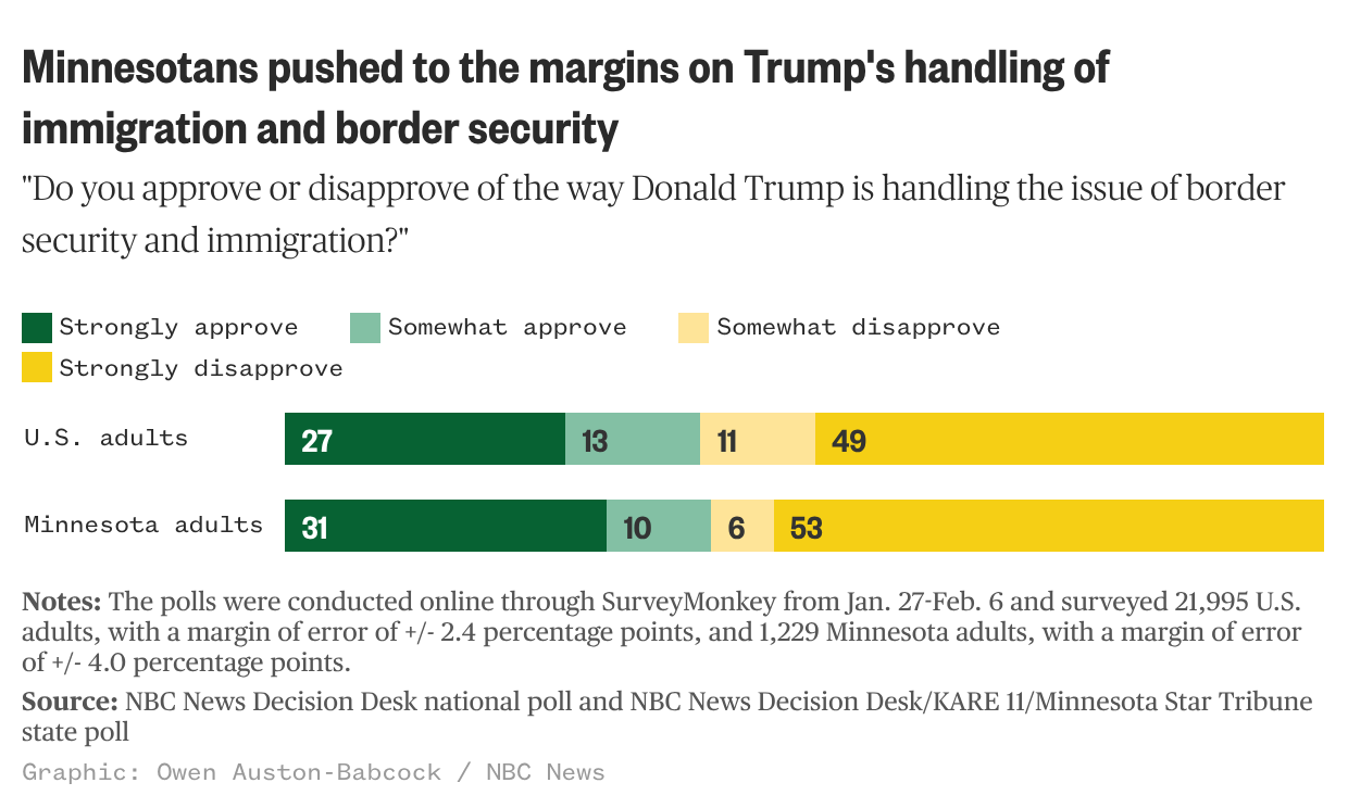 Theo hai cuộc thăm dò dư luận do NBC News Decision Desk thực hiện trên toàn quốc và cụ thể là ở Minnesota vào cuối tháng 1 và đầu tháng 2, được tiến hành bởi SurveyMonkey. Các cuộc thăm dò này được thực hiện sau khi các nhân viên nhập cư liên bang bắn chết Renee Good và Alex Pretti . và trước khi chính quyền Trump bắt đầu rút các nhân viên nhập cư khỏi Minneapolis.