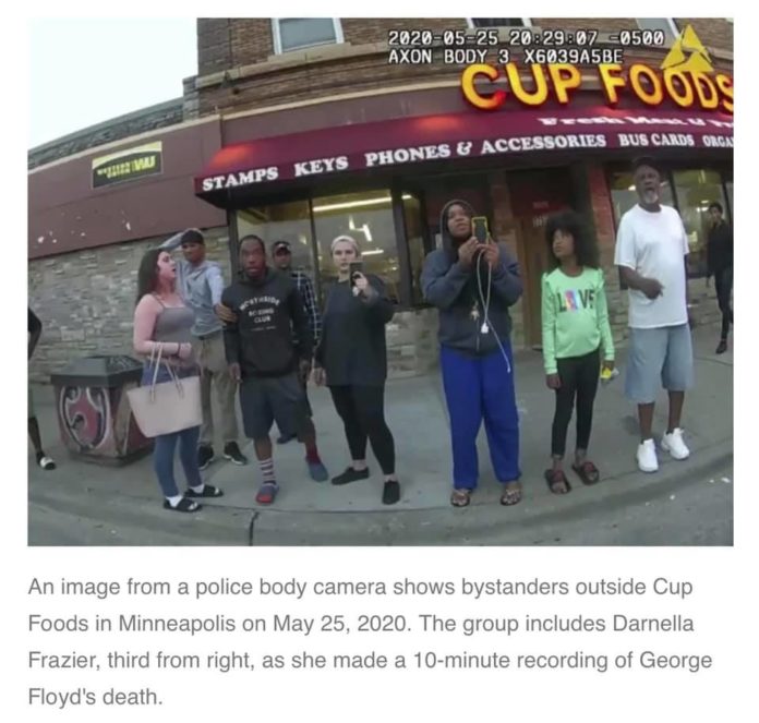 Tấm hình nổi tiếng: Một tấm hình trích từ một camera được gắn trên người của cảnh sát cho thấy một nhóm những người ngoài đường đang đứng trước cửa hàng Cup Foods ở Minneapolis vào ngày 25 tháng 5 năm 2020. Trong nhóm người này có Darnella Frazier, đứng thứ ba từ bên phải, khi cô ấy đang thu hình lại một đoạn video dài 10 phút về cái c h ế t của George Floyd.