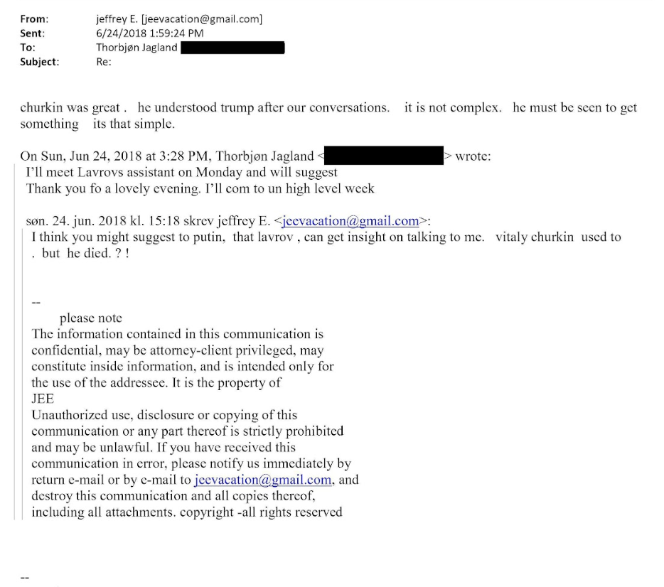 Trong một cuộc trao đổi với chính trị gia người Na Uy Thorbjørn Jagland, Epstein đã yêu cầu ông chuyển lời nhắn của mình tới Vladimir Putin trước khi hai tổng thống gặp nhau tại Helsinki.