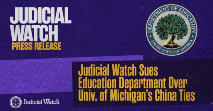 Tổ chức Judicial Watch hôm nay thông báo đã đệ đơn kiện theo Đạo luật Tự do Thông tin (FOIA) đối với Bộ Giáo dục Hoa Kỳ, yêu cầu cung cấp các hồ sơ liên quan đến mối quan hệ của Đại học Michigan với Trung Quốc, bao gồm cả các trao đổi với Bộ Tư pháp Hoa Kỳ