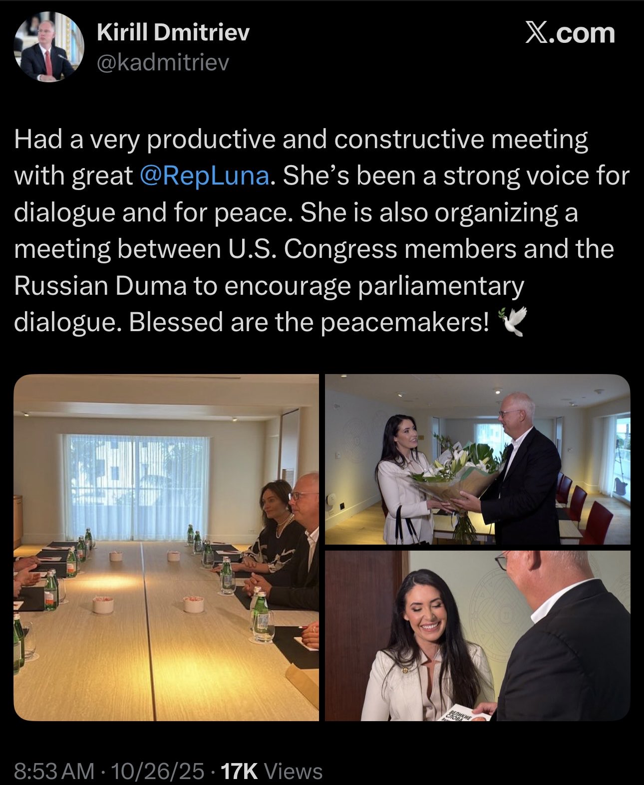 Trong ảnh từ Kirill Dmitriev – đặc phái viên kinh tế của Nga – đăng trên X (trước là Twitter) nói rằng ông “had a very productive and constructive meeting with great Anna Paulina Luna … She is also organizing a meeting between U.S. Congress members and the Russian Duma…” (X (formerly Twitter))