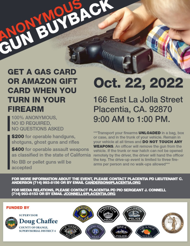 Santa Ana, CA. (October 7, 2022) – Supervisor Doug Chaffee, Chairman of the Orange County Board of Supervisors in partnership with the District Attorney, Anaheim, Brea, Buena Park, Fullerton, La Habra, Orange, and Placentia Police Departments today announced an Anonymous Gun Buyback program on October 22 from 9:00 a.m. to 1:00 p.m. at 166 East La Jolla Street, Placentia, CA 92870.