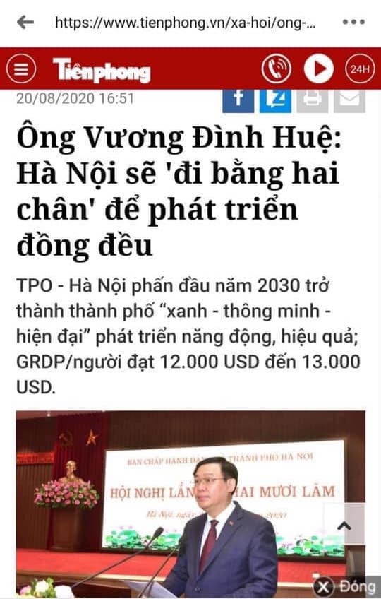 Ông Huệ khẳng định rằng, thu nhập bình quân đầu người tại TP Hà Nội vào năn 2030 sẽ đạt được đạt 12.000-13.000 USD. Mẹ kiếp xin đừng nói xa sôi làm gì và hãy quân tâm tới cuộc sống của người dân trong những tháng ngày hiện tại, hỗ trợ người dân trong 2 đợt đại dịch Covid 19 này mới là việc làm thiết thực.