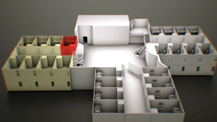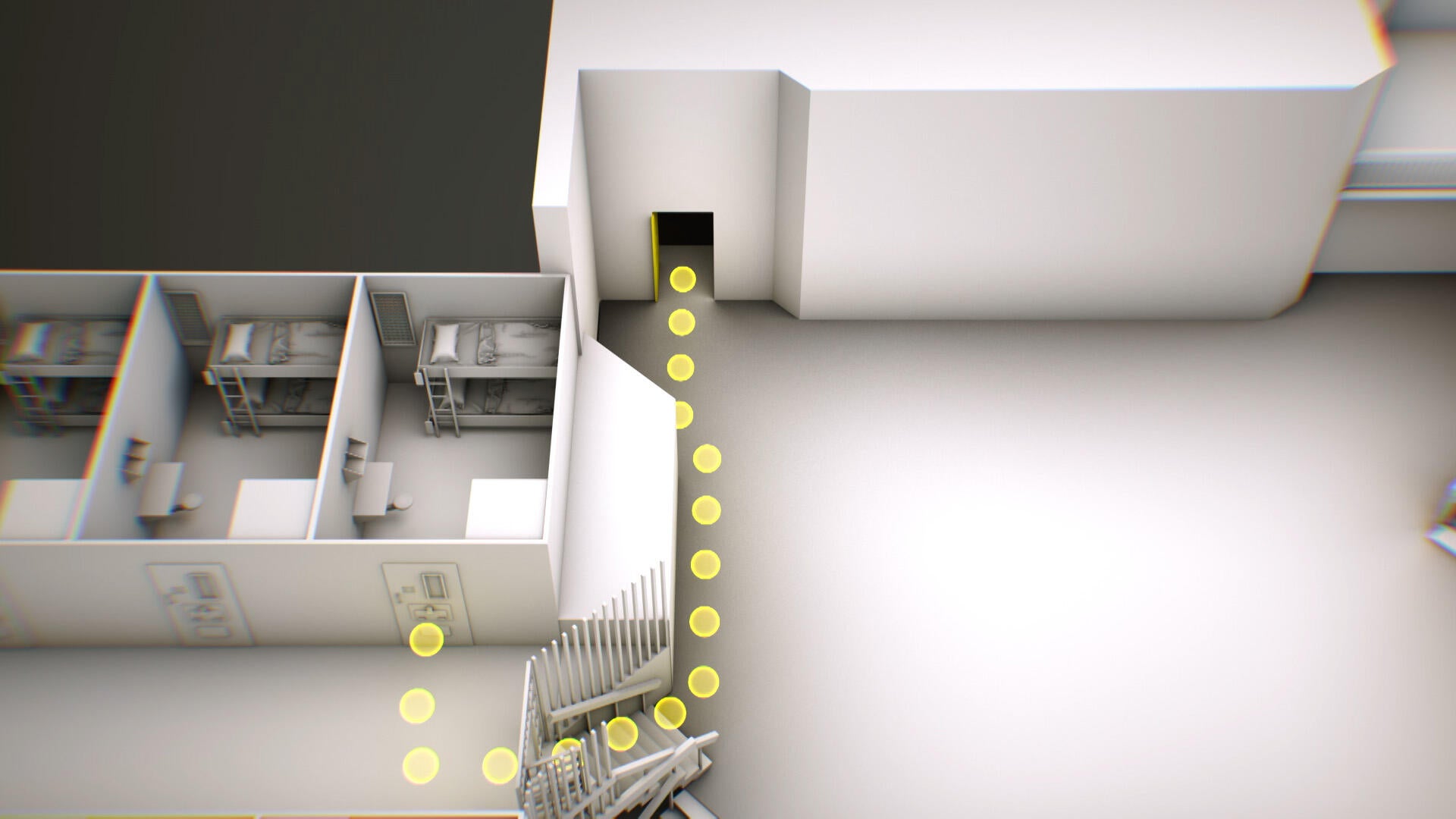Hình minh họa này cho thấy con đường từ lối vào khu vực sinh hoạt chung của khu giam giữ đặc biệt đến cầu thang dẫn lên phòng giam của Epstein. Chỉ một phần nhỏ của cầu thang có thể được nhìn thấy trong đoạn video do các quan chức liên bang công bố. CBS News.