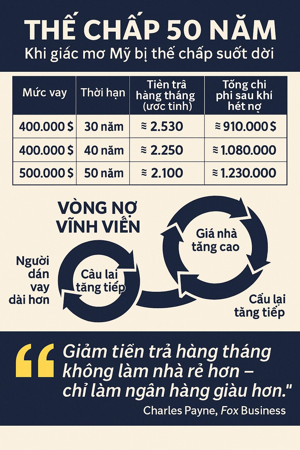 “Thế chấp 50 năm” có thể là liều thuốc an thần cho thị trường và đòn chính trị ngắn hạn cho chính quyền Trump, nhưng về dài hạn, nó đặt nền móng cho một xã hội nơi người dân sống cả đời trong nợ, còn hệ thống tài chính thì sống cả đời trên lãi.