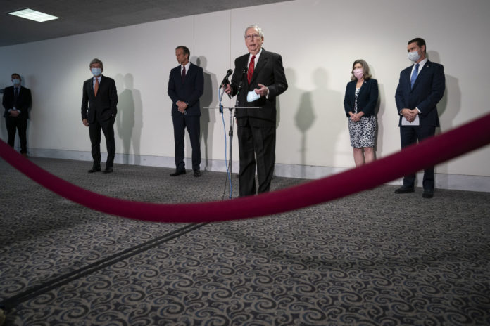 Thượng Nghị Sĩ Mitch McConnell (Cộng Hòa-Kentucky) nói chuyện với các phóng viên tại một cuộc họp báo Thượng Viện. (Hình: Drew Angerer/Getty Images)