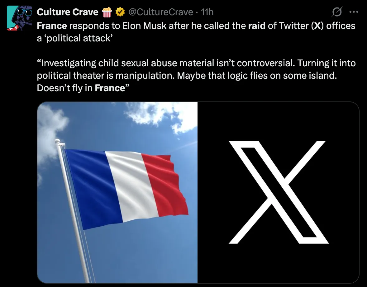 Tuần này, chính phủ Pháp đã đột kích vào văn phòng của X, nền tảng mạng xã hội của Elon Musk, tại Paris, như một phần của cuộc điều tra hình sự về “Lạm dụng tình dục trẻ em” liên quan đến Hồ sơ Epstein và nhiều hơn thế nữa.