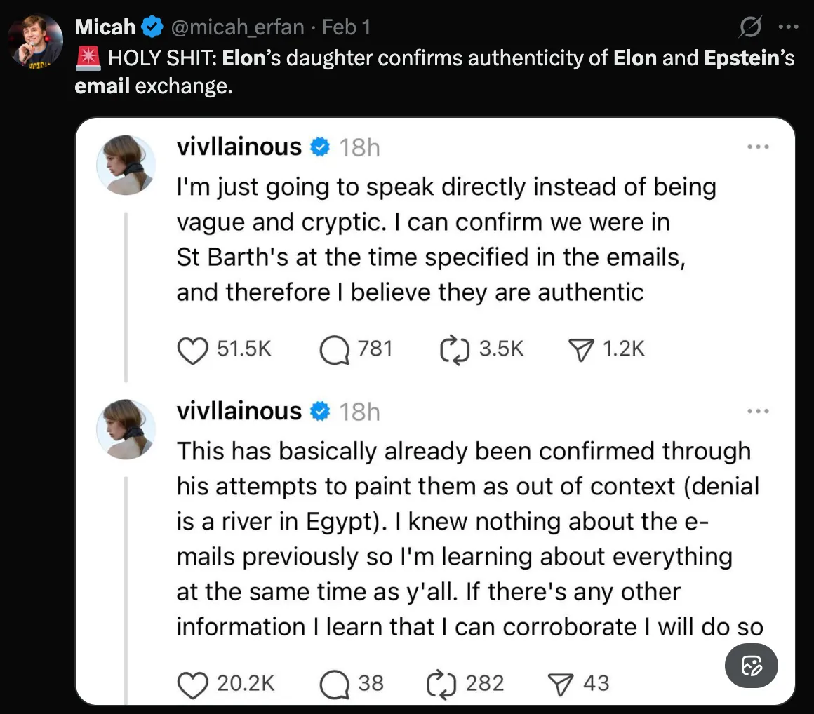 Con gái ông xác nhận rằng Elon và Epstein là bạn bè và Musk chắc chắn là khách quen của Epstein (trên đảo và ở New York).