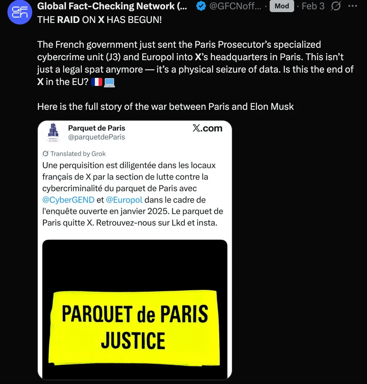 Các nhà chức trách Pháp — và các đối tác châu Âu của họ — đã theo dõi Elon Musk từ lâu. Chính thức, cơ quan thực thi pháp luật Pháp đang phản hồi các khiếu nại của người tố giác về “lạm dụng tình dục trẻ vị thành niên” và việc nhận tài trợ từ các thực thể nước ngoài nhằm gây bất ổn cho chính phủ Pháp bằng cách hợp tác với các nhóm cực hữu địa phương được Nga tài trợ (đã được chứng minh tại tòa án) với các lãnh đạo cực hữu được Nga hậu thuẫn của Pháp.