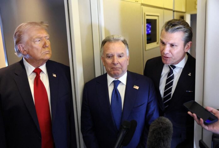 Tổng thống Donald Trump phát biểu với các phóng viên trong khi Đặc phái viên Nhà Trắng về Trung Đông Steve Witkoff (ở giữa) và Bộ trưởng Quốc phòng Pete Hegseth lắng nghe trên chuyên cơ Air Force One từ Căn cứ Không quân Dover, Delaware đến Miami, thứ Bảy, ngày 7 tháng 3 năm 2026. (Ảnh AP/Mark Schiefelbein)