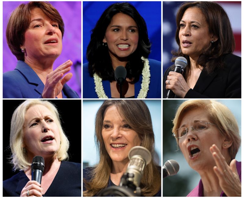 Từ trái, trên xuống dưới: Amy Klobuchar, Tulsi Gabbard, Kamala Harris, Kirsten Gillibrand, Marianne Williamson, Elizabeth Warren