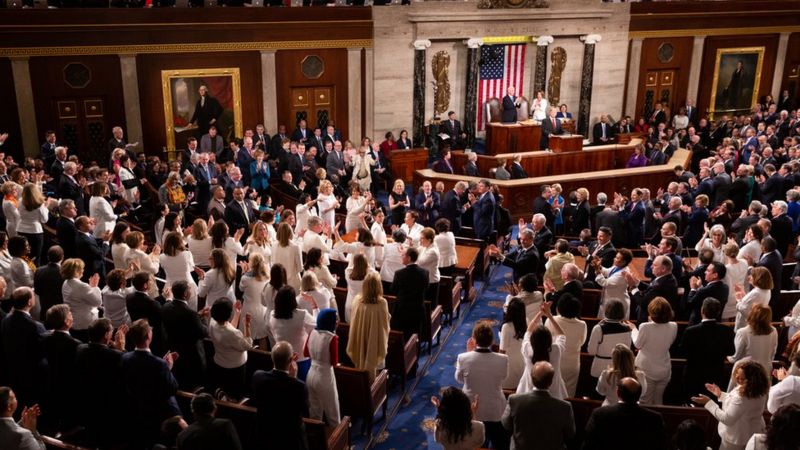 Thành viên nữ của đảng Democrats tại diễn văn liên bang mặc quần áo trắng để ăn mừng con số thành viên lớn trong Quốc hội