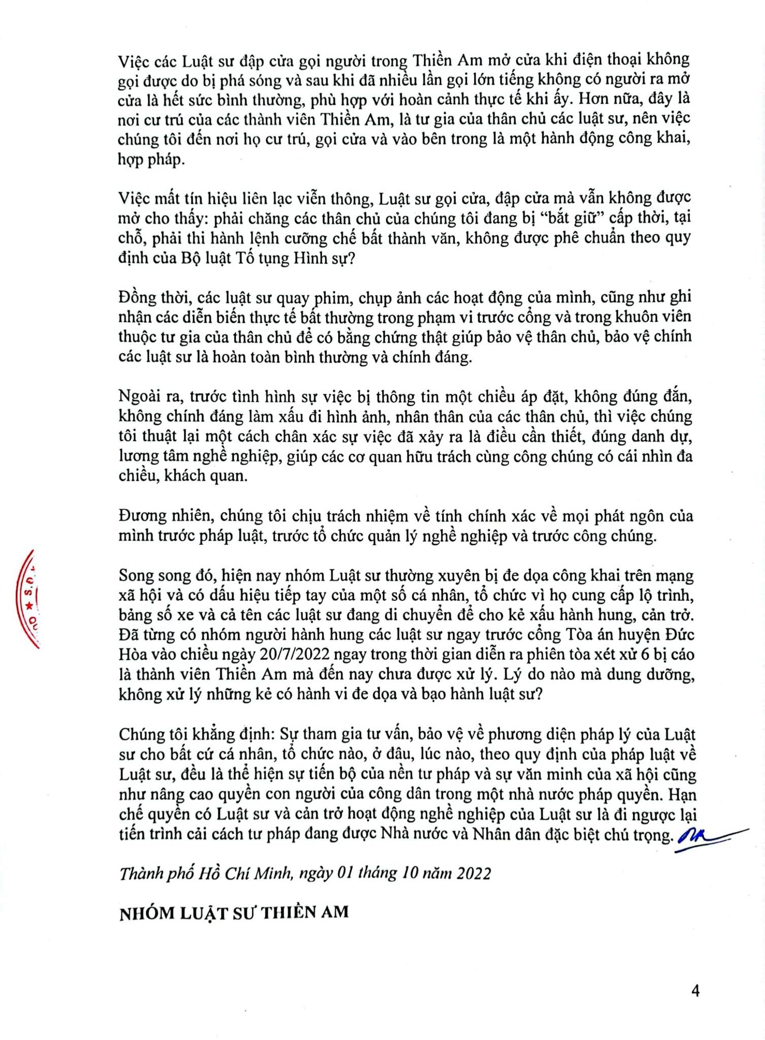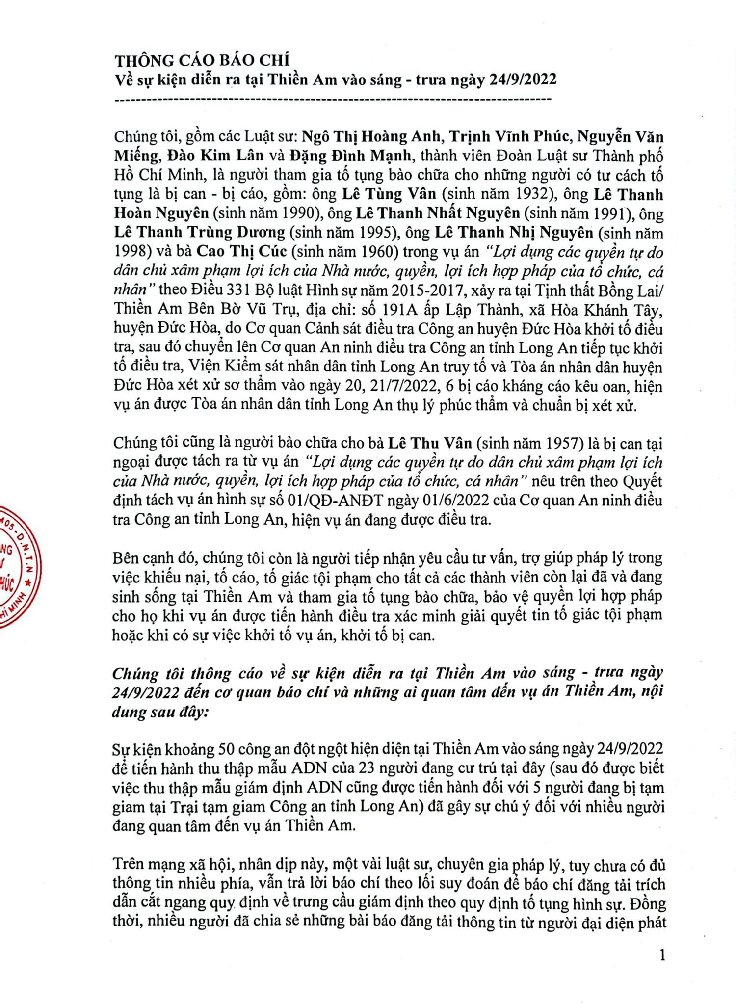 Việc nhóm Luật sư 5 người có mặt tại Thiền Am vào trưa ngày 24/9/2022 là hoàn toàn chính đáng và hợp pháp, bởi chúng tôi có mặt là theo yêu cầu khẩn thiết của thân chủ chúng tôi, bao gồm ông Lê Tùng Vân, bà Lê Thu Vân là người chúng tôi đang có trách nhiệm bào chữa trong vụ án theo Điều 331 Bộ luật Hình sự 2015-2017 và các thành viên khác ở Thiền Am là những người đã có văn bản yêu cầu chúng tôi tư vấn, trợ giúp pháp lý và tham gia tố tụng bào chữa, bảo vệ khi họ bị tiến hành các hoạt động tố tụng…
