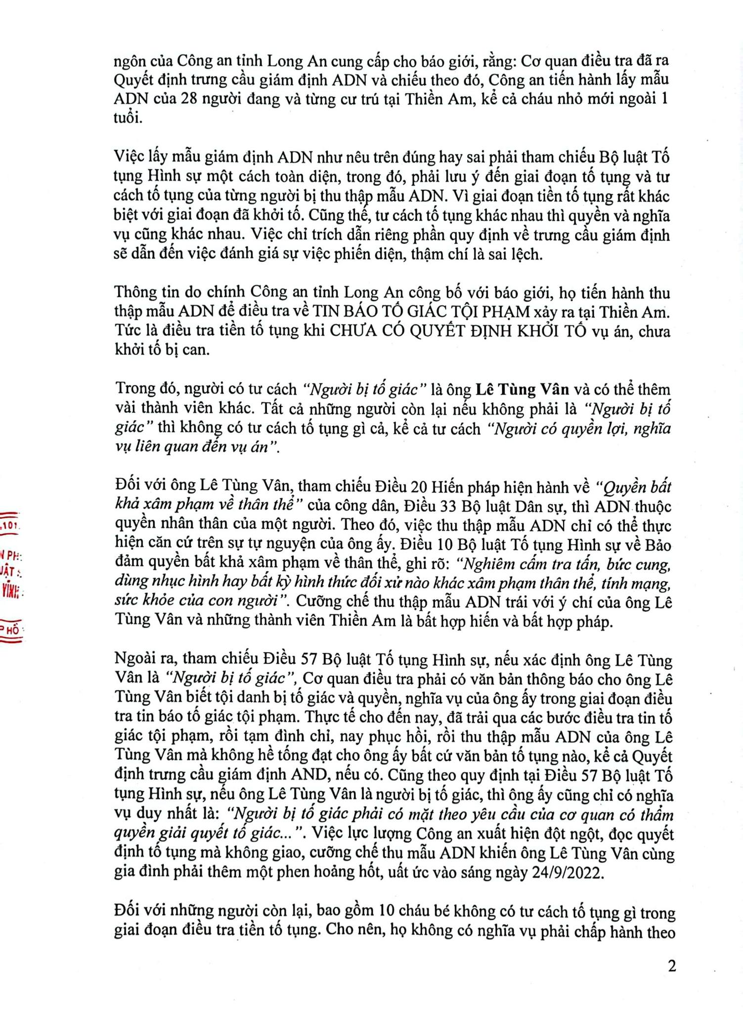 Ngoài ra, tham chiếu Điều 57 Bộ luật Tố tụng Hình sự, nếu xác định ông Lê Tùng Vân là “Người bị tố giác”, Cơ quan điều tra phải có văn bản thông báo cho ông Lê Tùng Vân biết tội danh bị tố giác và quyền, nghĩa vụ của ông ấy trong giai đoạn điều tra tin báo tố giác tội phạm. Thực tế cho đến nay, đã trải qua các bước điều tra tin tố giác tội phạm, rồi tạm đình chỉ, nay phục hồi, rồi thu thập mẫu ADN của ông Lê Tùng Vân mà không hề tống đạt cho ông ấy bất cứ văn bản tố tụng nào, kể cả Quyết định trưng cầu giám định AND, nếu có. Cũng theo quy định tại Điều 57 Bộ luật Tố tụng Hình sự, nếu ông Lê Tùng Vân là người bị tố giác, thì ông ấy cũng chỉ có nghĩa vụ duy nhất là: “Người bị tố giác phải có mặt theo yêu cầu của cơ quan có thẩm quyền giải quyết tố giác…”. Việc lực lượng Công an xuất hiện đột ngột, đọc quyết định tố tụng mà không giao, cưỡng chế thu mẫu ADN khiến ông Lê Tùng Vân cùng gia đình phải thêm một phen hoảng hốt, uất ức vào sáng ngày 24/9/2022.
