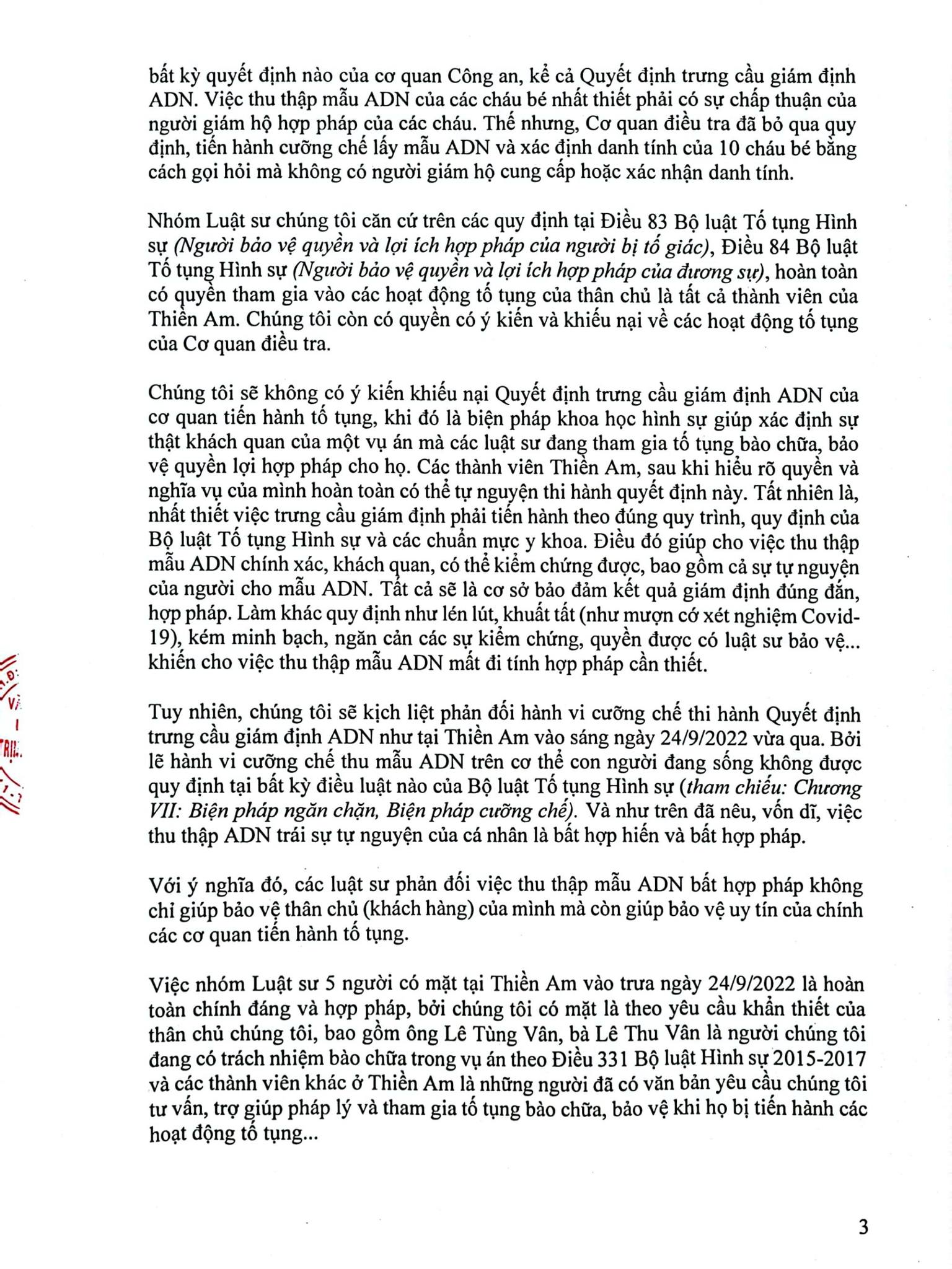 Chúng tôi sẽ không có ý kiến khiếu nại Quyết định trưng cầu giám định ADN của cơ quan tiến hành tố tụng, khi đó là biện pháp khoa học hình sự giúp xác định sự thật khách quan của một vụ án mà các luật sư đang tham gia tố tụng bào chữa, bảo vệ quyền lợi hợp pháp cho họ. Các thành viên Thiền Am, sau khi hiểu rõ quyền và nghĩa vụ của mình hoàn toàn có thể tự nguyện thi hành quyết định này. Tất nhiên là, nhất thiết việc trưng cầu giám định phải tiến hành theo đúng quy trình, quy định của Bộ luật Tố tụng Hình sự và các chuẩn mực y khoa. Điều đó giúp cho việc thu thập mẫu ADN chính xác, khách quan, có thể kiểm chứng được, bao gồm cả sự tự nguyện của người cho mẫu ADN. Tất cả sẽ là cơ sở bảo đảm kết quả giám định đúng đắn, hợp pháp. Làm khác quy định như lén lút, khuất tất (như mượn cớ xét nghiệm Covid-19), kém minh bạch, ngăn cản các sự kiểm chứng, quyền được có luật sư bảo vệ… khiến cho việc thu thập mẫu ADN mất đi tính hợp pháp cần thiết.