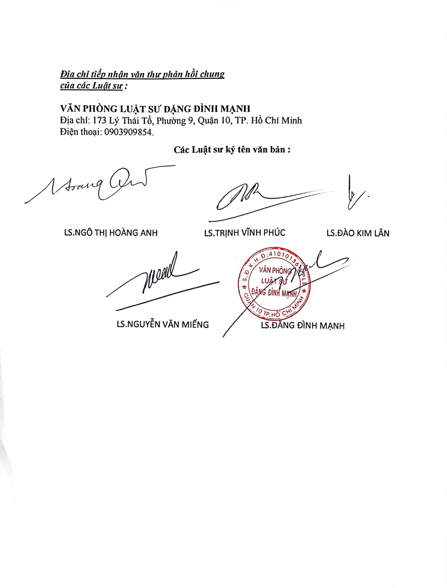 Ngoài ra, trước tình hình sự việc bị thông tin một chiều áp đặt, không đúng đắn, không chính đáng làm xấu đi hình ảnh, nhân thân của các thân chủ, thì việc chúng tôi thuật lại một cách chân xác sự việc đã xảy ra là điều cần thiết, đúng danh dự, lương tâm nghề nghiệp, giúp các cơ quan hữu trách cùng công chúng có cái nhìn đa chiều, khách quan.